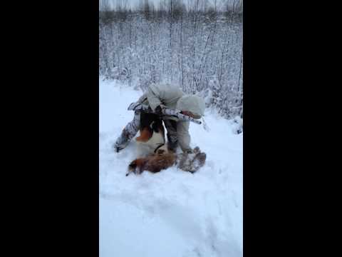 En skadad räv som stövarn drivit in. När de står första kontakt har hunden skällt i ca 2 minuter redan.