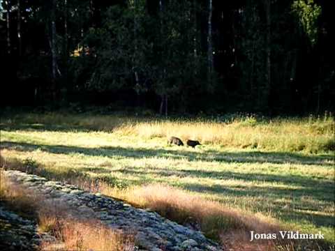 Two wild boars calmly pasturing one warm August morning in Bogesund just outside Stockholm, Sweden.
